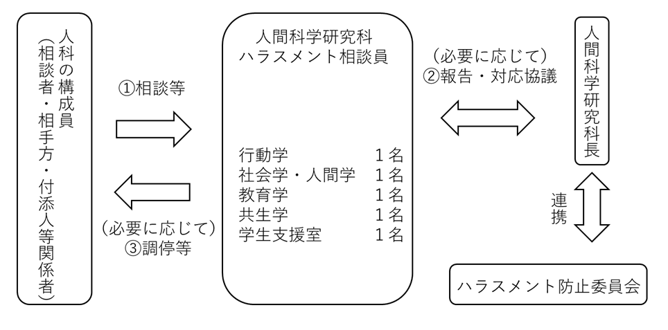 *人間科学研究科では、平成23年7月28日から研究科内に人間科学研究科・人間科学部ハラスメント相談室を設置して、上述の体制を築いています。本ページでは、大学全体の「ハラスメント相談室」と区別しやすくするために、人科ハラスメント相談員制度という通称を用いています。