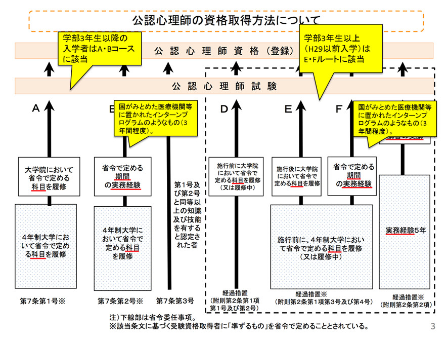 - 平成30(2018)年4月以降に大学に入学する場合の受験資格取得方法は、区分A、Bになります。なお、区分A、Bで公認心理師国家試験の受験資格を得るためには、法施行規則で定める科目の単位修得が必要です。