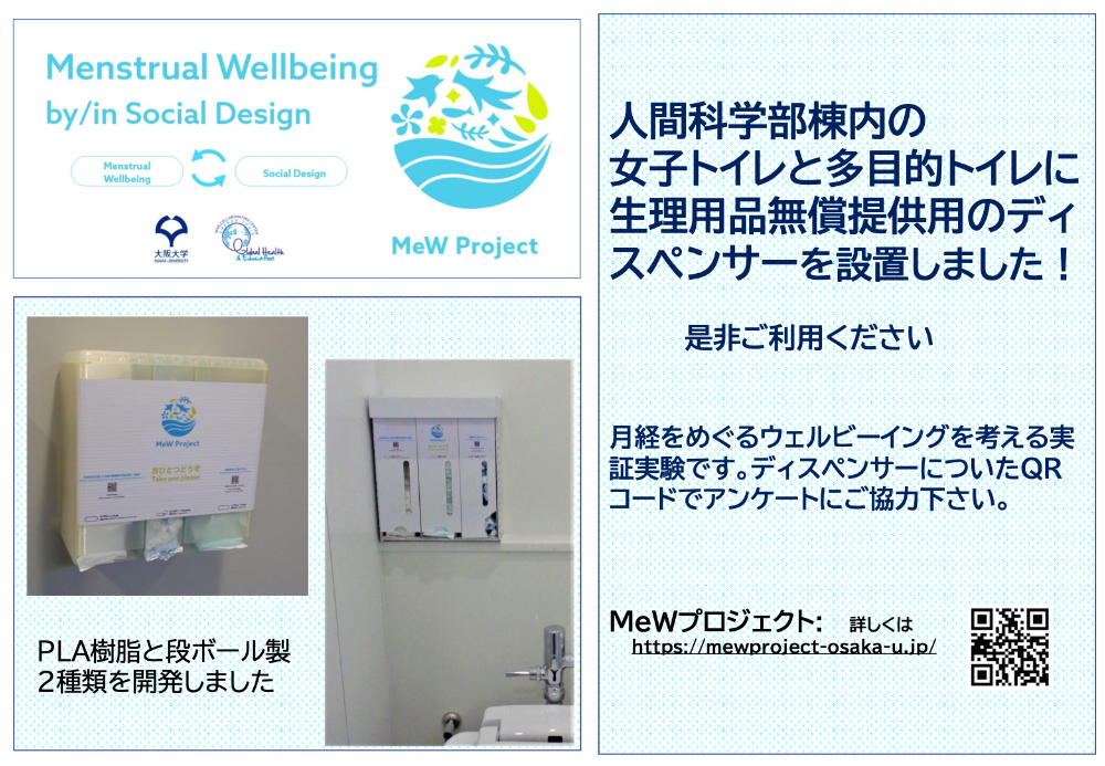 月経をめぐるウェルビーイングを考える実証実験として、人間科学部棟内の女子トイレと多目的トイレに生理用品無償提供用のディスペンサーを設置しました!