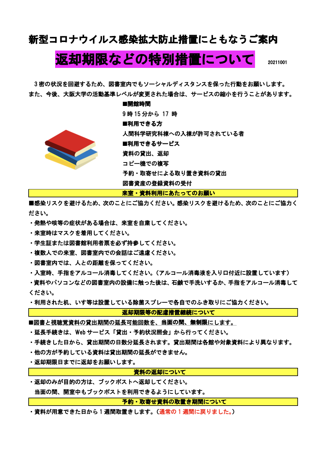 Tue, 10/05/2021 - 08:00 お知らせ 人科図書室 予約・取寄せ資料の取置き期間について変更お知らせ ドキュメントダウンロード 開室・一部サービスの再開と返却期限などの特別措置について(PDF) 予約・取寄せ資料の取置き期間の延長(通常1週間→2週間)を行っておりましたが、 10月1日より通常の1週間に戻りました。ご注意下さい。