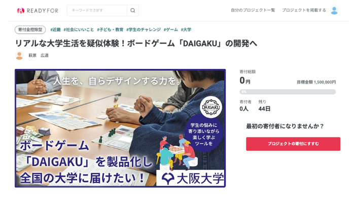 大阪大学大学院人間科学研究科 萩原広道 助教、同大学文学部 青木海さん(1年生)、工学部 倉谷聡さん(1年生)、中島規希さん(1年生)、西村知晃さん(1年生)のプロジェクトチームは、リアルな大学生活を疑似体験するボードゲーム「DAIGAKU」を開発しました。現代の大学生が抱く不安や悩みを共有・解消する「楽しい教育ツール」としてこのゲームを改良し、さらに製品化・配布するため、2月14日(水)9時より、READYFOR(レディフォー)にてクラウドファンディングを開始しました。