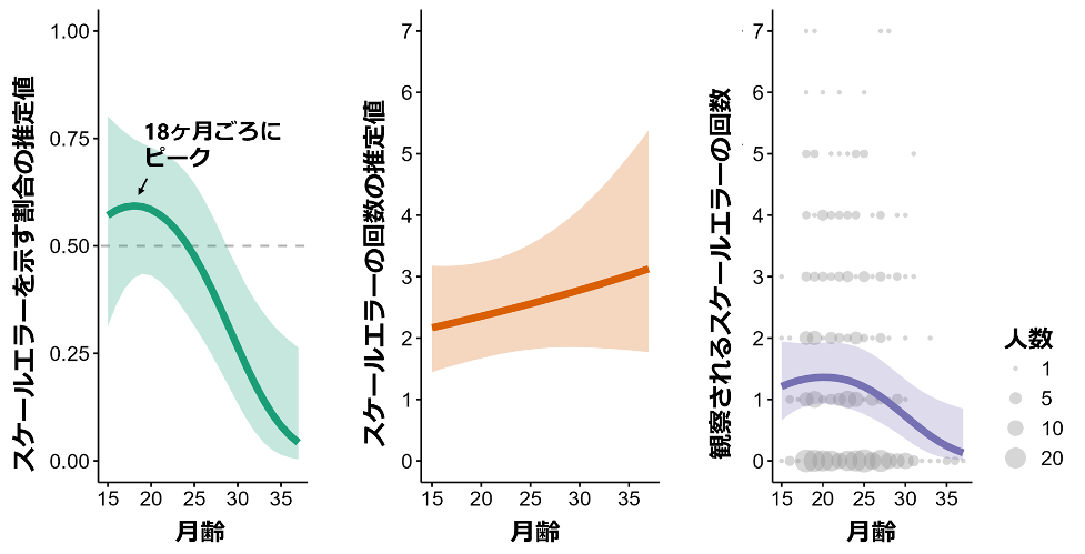 ◆ 観察中にスケールエラーを示さない子どもが多く、スケールエラーの生起頻度の推定は困難だったが、ゼロ過剰ポアソンモデルという統計モデルを用いることで可能に