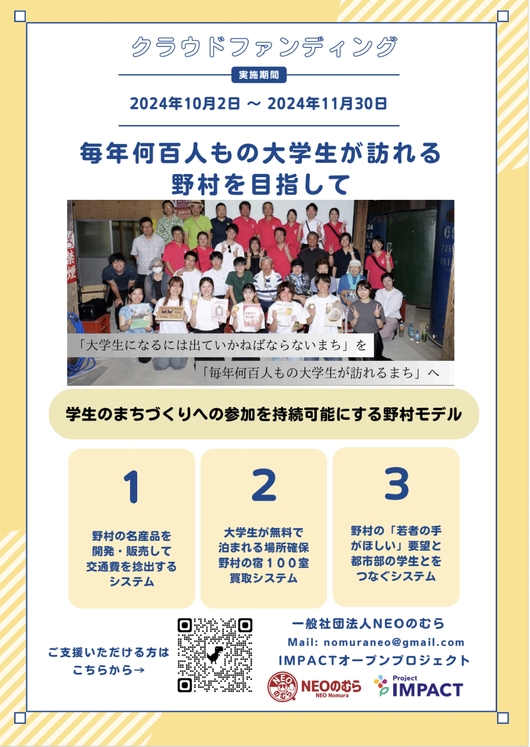 毎年何百人もの大学生が訪れる野村を目指して、クラウドファンディングを実施しております(実施期間:2024年10月2日~2024年11月30日)。