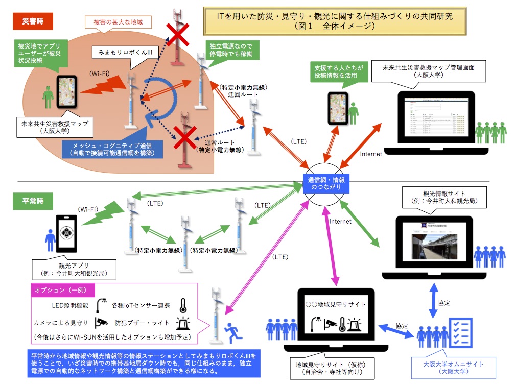 防災見守り共同研究は、大阪大学が開発した「未来共生災害救援マップ(略称:災救マップ)」と、(一社)全国自治会活動支援ネットの発案による「みまもりロボくんⅢ」とを活用し、災害時には避難所情報等に係る被災者と支援者の双方向通信を通じた被災地支援の仕組みの構築を、平常時には観光情報や高齢者・子どもの見守り等に係る防犯情報の双方向通信を通じた観光推進・安全安心を目指し、取り組んでいるものです。