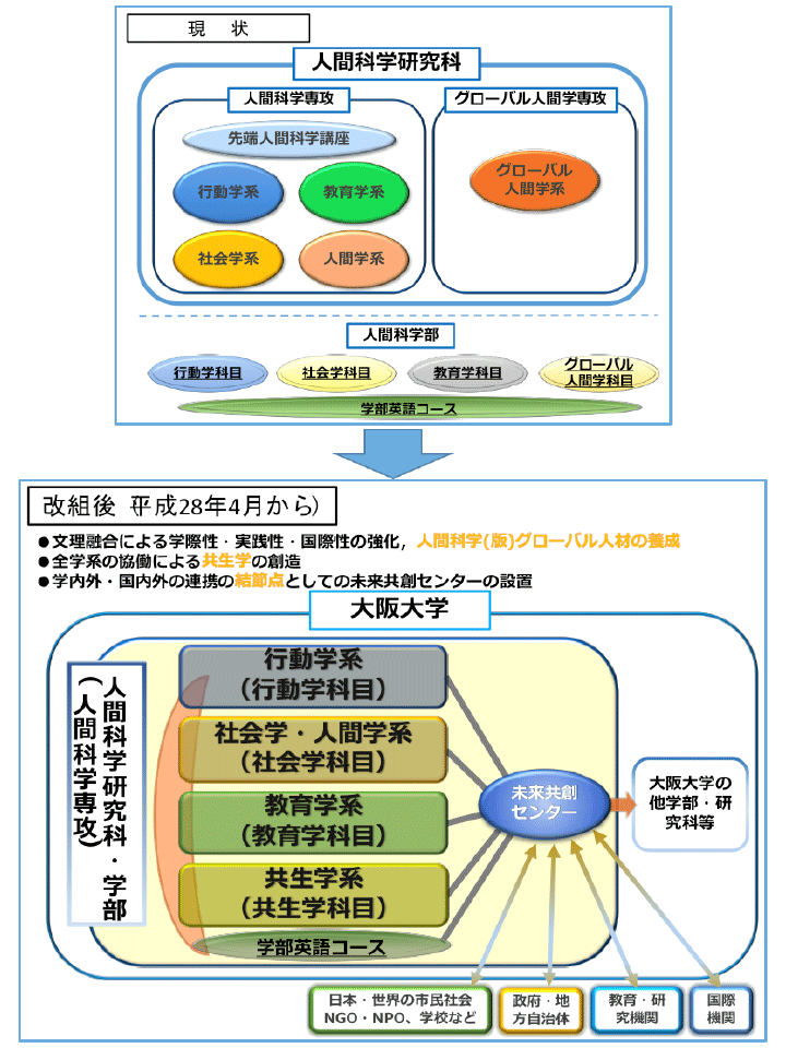 2016年(平成28年)4月に、大阪大学大学院人間科学研究科は、学際性、実践性、国際性に基づいた教育・研究活動をより一層充実させ、新たな学問領域を開拓することを目的として改組しました。
