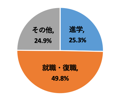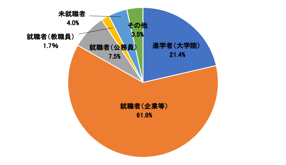 例年、卒業生の2〜3割が大学院に進学し、5~6割程度が民間企業に就職、1割程度が公務員になっています。