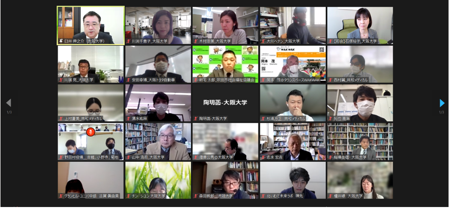 第二部では新たに協定を結ぶことになった3団体より協定に基づく取り組みが紹介されました。最初に大阪トヨタ⾃動⾞株式会社の安⽥幸博様より「防災」をキーワードに大阪大学人間科学研究科の稲場教授の取り組まれている独立電源通信装置「たすかんねん」が大阪トヨタ⾃動⾞株式会社様の本社ビル屋上に設置されるまでの流れの報告を頂きました。次に吹田市社会福祉協議会の新宅様には大阪府北部地震をきっかけに大阪大学と様々な団体と共に吹田市災害ボランティアセンターが立ち上がった過程や、その後のコロナ禍における高齢者支援に関する活動、そして、グルーバルビジレッジ津雲台における住民のつながりに関する活動の報告をして頂きました。最後は一般社団法⼈パースペクティブの松山様には貴団体が運営されている「工藝の森」と大阪大学との関わりについて紹介をして頂きました。「工藝の森」では森を起点に森づくりとモノづくりの両方に関わりながら、様々な人々を巻き込んでいく活動を展開しています。その中で知の共創という視点から大阪大学のエスのグラフィーラボがマテリアルフロー調査やデザイン人類学的教育プロジェクトなどを共同で展開しています。