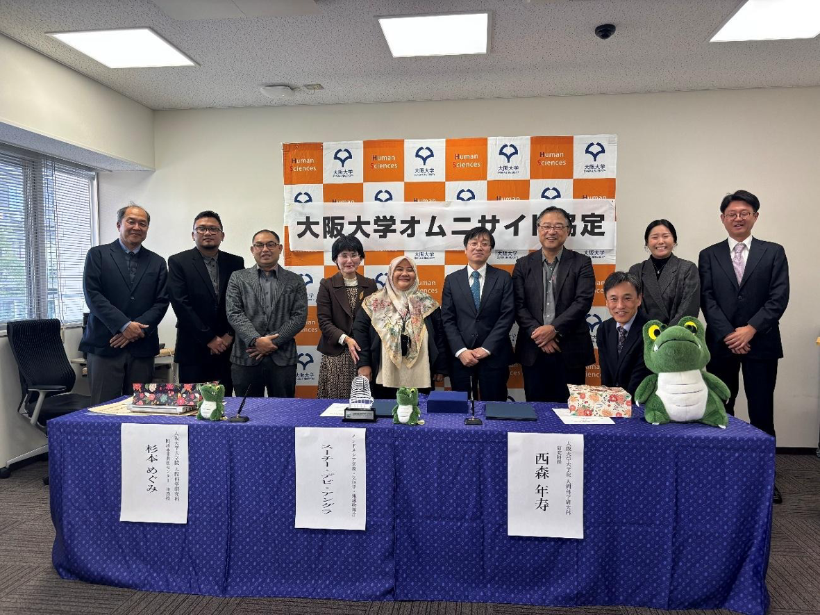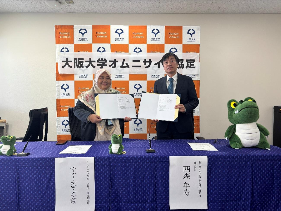 The signing ceremony for the University of Osaka Omni-Site Agreement (hereinafter referred to as the "OOS Agreement") was held at the Graduate School of Human Sciences Main Building, with the participation of representatives from the Indonesian Agency for Meteorology, Climatology and Geophysics (BMKG) and members of the Graduate School of Human Sciences at the University of Osaka December 10, 2025.